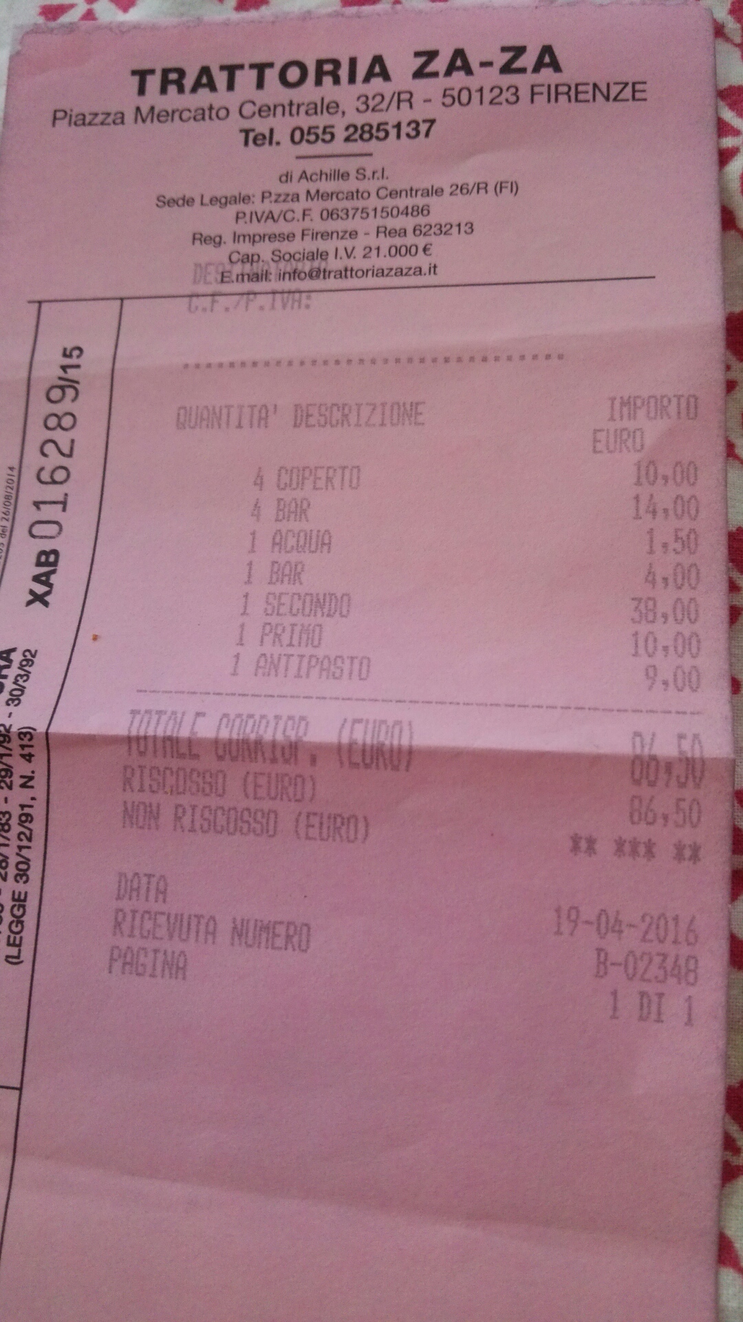 LOOK JTB フリープランで行ったイタリア その6フィレンツェのからローマへの移動日 イタリア 2016年05月23日 0 70歳半ばの夫の両親と一緒のイタリア旅行4日目はフィレンツェからローマの移動日でした。【JTBの海外ツアー】フリープランイタリアでは、到着日にフィレンツェでローマまでの鉄道の切符(Eチケット)をもらいました。出発の10日前に予定便をJTBに問い合わせて教えてもらいましたが、変更はありませんでした。宿泊したグランドホテル バリオーニ をチェックアウトの際は宿泊税を支払いました。いくら払うかはチェックイン時にJTBの係員から案内がありました。1泊一人4.5ユーロ合計4人3泊で54ユーロでした。それなりの金額ですね。ホテルから駅への送迎をつけていないのでこの日はフィレンツェ中央駅へ自分たちで移動しました。ホテルの目の前に駅に続く地下道の入り口がありスロープで降りて駅のエレベーターで上がることができるので、スーツケースを持って歩いて5分強で駅に到着です。ホームの奥にあるVENCHIでお土産のチョコレートを購入しジェラードを食べました。テキパキとそれでいて愛想のいい店員さんが対応してくれました。 私が乗車したのは11:08発のナポリ行き。到着時にもらったEチケットの案内です。 出発便掲示板でプラットホームの番号を確認するのですが、10分前位にやっとホームがわかりました。5分遅れのようです。座席指定がされているEチケットは刻印が不要とのことでしたのでそのまま列車に乗り込みました。刻印について詳しくはトレニタリア社の利用情報 をみて下さい。列車の扉付近に大型の荷物置場がありそこに大きなスーツケースを置くのですが、列車が発車するギリギリに盗難に合うことがあるので、出発までと途中駅ではできたら見張っておいてくださいと注意がありました。また、ローマ到着の際ローマには複数の主要駅があり、ローマティブルティーナ駅にも停車しますが、必ずローマテルミニ駅で下車するように案内がありました。約1時間半、10分遅れで無事にテルミニ駅に到着しました。テルミニ駅は治安も悪く、荷物をもってウロウロしたくないので、事前にテヴェレリムジンサービス でタクシーの予約をしておきました。日本語で丁寧なやり取りをしていただきましたが、ここはイタリア、本当に来るかなぁと少し不安でしたが、ドライバーさんがネームプレートをもって待っていてくれました。ホテルまでは2km弱、1台45ユーロと通常よりはお高いですが、待ち時間もなく安心して利用できました。もしJTB のプランで送迎をつけるとなんと一人12,000円、4人で48,000円比べれば安いものでした。 [0回]