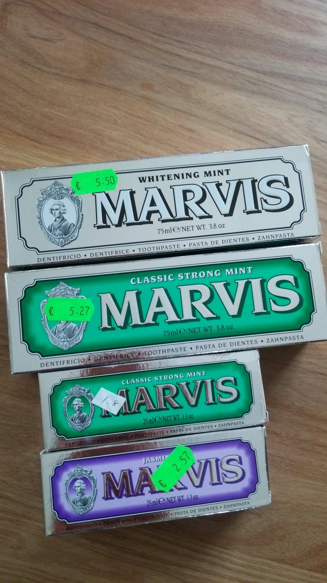 日本のMARVISオフィシャルサイトでは緑のクラッシックミントの大で1800円(税別)なのでお値打ちに購入できます。