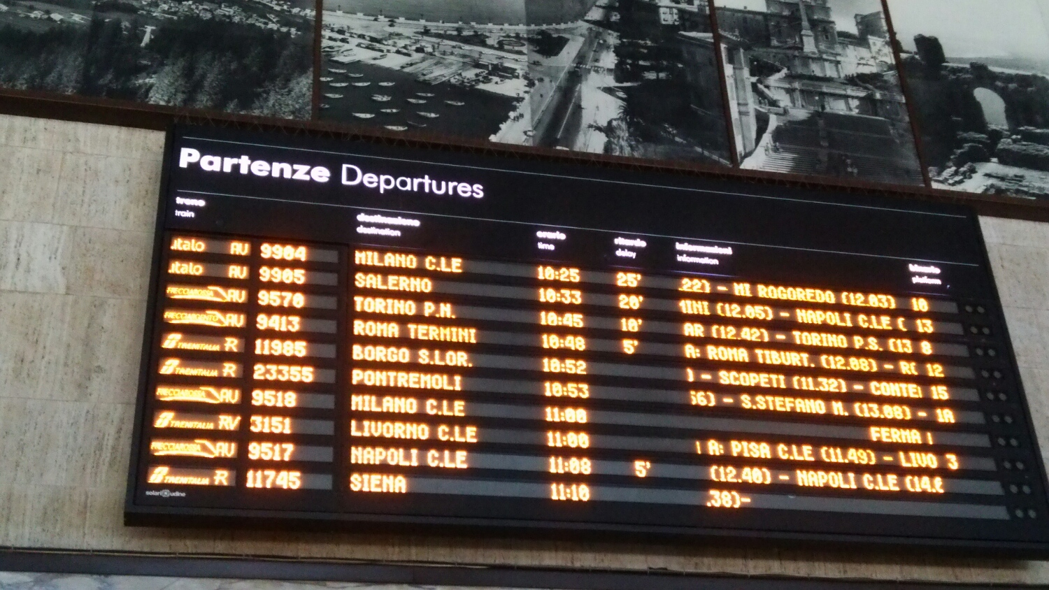 LOOK JTB フリープランで行ったイタリア その6フィレンツェのからローマへの移動日 イタリア 2016年05月23日 0 70歳半ばの夫の両親と一緒のイタリア旅行4日目はフィレンツェからローマの移動日でした。【JTBの海外ツアー】フリープランイタリアでは、到着日にフィレンツェでローマまでの鉄道の切符(Eチケット)をもらいました。出発の10日前に予定便をJTBに問い合わせて教えてもらいましたが、変更はありませんでした。宿泊したグランドホテル バリオーニ をチェックアウトの際は宿泊税を支払いました。いくら払うかはチェックイン時にJTBの係員から案内がありました。1泊一人4.5ユーロ合計4人3泊で54ユーロでした。それなりの金額ですね。ホテルから駅への送迎をつけていないのでこの日はフィレンツェ中央駅へ自分たちで移動しました。ホテルの目の前に駅に続く地下道の入り口がありスロープで降りて駅のエレベーターで上がることができるので、スーツケースを持って歩いて5分強で駅に到着です。ホームの奥にあるVENCHIでお土産のチョコレートを購入しジェラードを食べました。テキパキとそれでいて愛想のいい店員さんが対応してくれました。 私が乗車したのは11:08発のナポリ行き。到着時にもらったEチケットの案内です。 出発便掲示板でプラットホームの番号を確認するのですが、10分前位にやっとホームがわかりました。5分遅れのようです。座席指定がされているEチケットは刻印が不要とのことでしたのでそのまま列車に乗り込みました。刻印について詳しくはトレニタリア社の利用情報 をみて下さい。列車の扉付近に大型の荷物置場がありそこに大きなスーツケースを置くのですが、列車が発車するギリギリに盗難に合うことがあるので、出発までと途中駅ではできたら見張っておいてくださいと注意がありました。また、ローマ到着の際ローマには複数の主要駅があり、ローマティブルティーナ駅にも停車しますが、必ずローマテルミニ駅で下車するように案内がありました。約1時間半、10分遅れで無事にテルミニ駅に到着しました。テルミニ駅は治安も悪く、荷物をもってウロウロしたくないので、事前にテヴェレリムジンサービス でタクシーの予約をしておきました。日本語で丁寧なやり取りをしていただきましたが、ここはイタリア、本当に来るかなぁと少し不安でしたが、ドライバーさんがネームプレートをもって待っていてくれました。ホテルまでは2km弱、1台45ユーロと通常よりはお高いですが、待ち時間もなく安心して利用できました。もしJTB のプランで送迎をつけるとなんと一人12,000円、4人で48,000円比べれば安いものでした。 [0回]