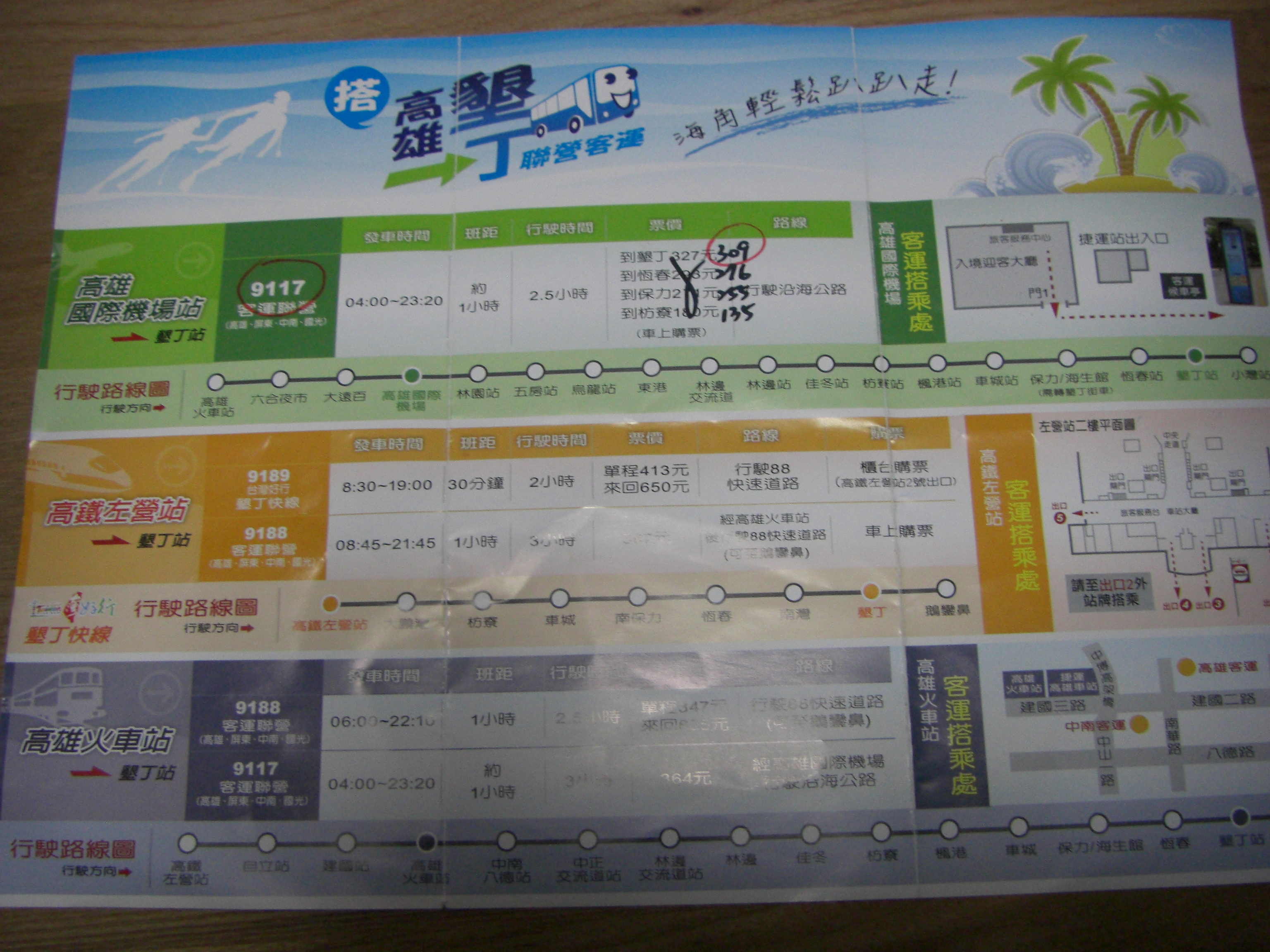 ピーチで行った懇丁、高雄 台湾 2015年05月27日 0 momoが実際旅したコースです。カップル、ファミリー向けです。 5/2(土) りんくうプレミアムアウトレットでショッピング (宿泊)ベルビューガーデンホテル関西空港 5/3(日) 送迎バス(予約制)8:30 ====8:45 関西空港第一ターミナル 関西空港11:10 ーーーMM35 ーーーー 13:15 高雄 出発遅れて13:40頃到着 高雄空港14:45頃==(9117バス)=====小湾 懇丁18:00頃 309元 高雄空港・・・入国審査混んでいました 入国カード必要 両手の指紋登録と写真撮影あり 出国後銀行にて両替 50,000円→レート0.2495→12,475元 手数料30元 1元 =約4円 インフォメーション(日本語OK)でバスの確認 ファミリーマートで買物 懇丁行きバス 9117は路線バスなので停車も多く左営から高速道路を使う9189バスのほうが停車が少なく早く到着するケースもあると思います。バスは乗車時支払い。インフォメーションでチケットを買っている人もいました。途中バスの乗務員から乗車券拝見がありました。ボタンを押して下車します。 大きな荷物は下の荷物庫に入れます。 宿泊したシーザーパークホテル懇丁 は小湾バス停の目の前で、隣はハワードプラザホテル。多くの方がここで下車しました。 バス停に貼ってあった時刻表 高雄というのは高雄駅発の時間でしょうか?? インフォメーションでもらったパンフレット (宿泊)シーザーパークホテル懇丁 2泊2名1室で31,695円(朝食付き) ゴールデンウィークでこのお値段ならお値打ちです。 (夕食)WARUNG DIDI オープンテラス席も多く賑わっていました。 ビールのおかわり(2杯目)を頼んだら3杯目はサービスよと言われて3杯ものんじゃいました。 5/4(月) (朝食)ホテルでビュッフェ たくさんの種類がありました。人も多くて何から取ったらいいのか迷います。 この日はホテルの近くで電動バイクを借りました。1日で800元。 電動バイクは日本の免許書も不要でノーヘル、二人乗りOK。スピードも最高45kmほど出て道も走りやすく快適です。今日は海辺を二人乗りでドライブです。 デザインも可愛い。パンダちゃん 小湾〜最南端〜風吹沙で折り返して〜小湾〜後壁湖 〜南湾〜小湾 ドライブの後はホテル前のビーチやホテルのビーチでのんびりしました。 ビーチでは部屋番号でタオルやパラソルを無料で貸してくれます。ビーチバーもありのんびりできます。 プールは帽子着用、というのが少し面倒です。 (夕食) レンタル電気バイクで南湾まで行きました。 パスタやカレーをオープンテラスでいただきました。 感じのいいマダムとそのご主人(欧米の方)で経営されているようでした。 BOSA NOVA BEACH CAFE 5/5(火) ホテルで朝食を取り、部屋のテラスでのんびりして過ごしました。 到着日にホテルが出している高雄行の無料バスを予約しました。 観光バスタイプの大型バスでしたが、ほぼ満席でした。往路と比べると直行便なので随分早く到着しました。 ホテル11:30===(バス)========13:15左営バスターミナル 左営+++++++++(地下鉄)+++++++三多商圏 ホテルまでは徒歩7,8分 目立つホテルなので迷わず行けますが入口が分かりにくかったです。 (宿泊)85スカイタワーホテル 1泊3700元(14754円)2名1室朝食付き ホテルで三多商圏駅までの無料のシャトルバス(当日予約制)に乗りショッピングへ。 お目当てはパイナップルケーキ。そごうの斜め前にある呷百二。お願いすれば試食もできます。パッケージや紙袋も可愛くて上品。外はサクサク中はしっとりで美味しかったです。 クレジットカードは使えませんでした。 夕食は「紅陶上海湯包」で小籠包を食べました。 高級そうな外観でしたが、お値段はそれほどでもなかったです。 ホテル→(徒歩10分)グランドハイライ百貨店10F「紅陶上海湯包」→(徒歩10分)マンゴー茶々でデザート→(目の前)右脚左脚で足マッサージ→(徒歩15分)ホテル 5/6(水) 最終日はホテルでゆっくり朝食を食べて、ホテルの周りを散策して、11:00のシャトルバスで三多商圏駅に送ってもらいました。 アートの街高雄には可愛いオブジェがたくさんあります。 三多商圏広場にて 地下鉄で空港まで15分ほど。 高雄 14:00ーーーーーMM36-ーーーーー17:55関西空港 [0回]PR