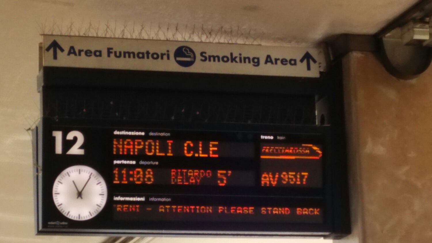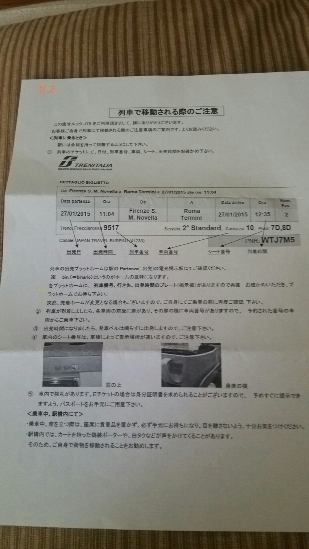 LOOK JTB フリープランで行ったイタリア その6フィレンツェのからローマへの移動日 イタリア 2016年05月23日 0 70歳半ばの夫の両親と一緒のイタリア旅行4日目はフィレンツェからローマの移動日でした。【JTBの海外ツアー】フリープランイタリアでは、到着日にフィレンツェでローマまでの鉄道の切符(Eチケット)をもらいました。出発の10日前に予定便をJTBに問い合わせて教えてもらいましたが、変更はありませんでした。宿泊したグランドホテル バリオーニ をチェックアウトの際は宿泊税を支払いました。いくら払うかはチェックイン時にJTBの係員から案内がありました。1泊一人4.5ユーロ合計4人3泊で54ユーロでした。それなりの金額ですね。ホテルから駅への送迎をつけていないのでこの日はフィレンツェ中央駅へ自分たちで移動しました。ホテルの目の前に駅に続く地下道の入り口がありスロープで降りて駅のエレベーターで上がることができるので、スーツケースを持って歩いて5分強で駅に到着です。ホームの奥にあるVENCHIでお土産のチョコレートを購入しジェラードを食べました。テキパキとそれでいて愛想のいい店員さんが対応してくれました。 私が乗車したのは11:08発のナポリ行き。到着時にもらったEチケットの案内です。 出発便掲示板でプラットホームの番号を確認するのですが、10分前位にやっとホームがわかりました。5分遅れのようです。座席指定がされているEチケットは刻印が不要とのことでしたのでそのまま列車に乗り込みました。刻印について詳しくはトレニタリア社の利用情報 をみて下さい。列車の扉付近に大型の荷物置場がありそこに大きなスーツケースを置くのですが、列車が発車するギリギリに盗難に合うことがあるので、出発までと途中駅ではできたら見張っておいてくださいと注意がありました。また、ローマ到着の際ローマには複数の主要駅があり、ローマティブルティーナ駅にも停車しますが、必ずローマテルミニ駅で下車するように案内がありました。約1時間半、10分遅れで無事にテルミニ駅に到着しました。テルミニ駅は治安も悪く、荷物をもってウロウロしたくないので、事前にテヴェレリムジンサービス でタクシーの予約をしておきました。日本語で丁寧なやり取りをしていただきましたが、ここはイタリア、本当に来るかなぁと少し不安でしたが、ドライバーさんがネームプレートをもって待っていてくれました。ホテルまでは2km弱、1台45ユーロと通常よりはお高いですが、待ち時間もなく安心して利用できました。もしJTB のプランで送迎をつけるとなんと一人12,000円、4人で48,000円比べれば安いものでした。 [0回]