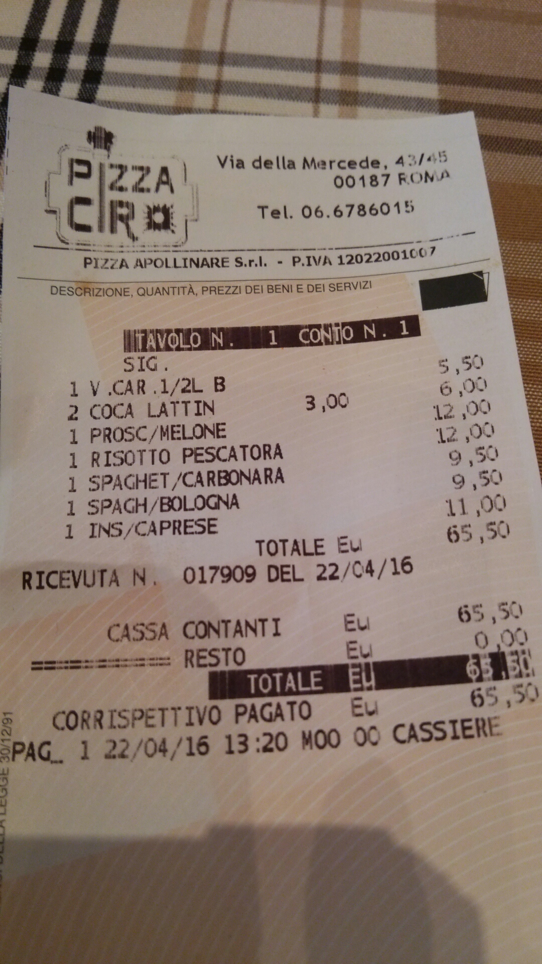 LOOK JTB フリープランで行ったイタリア その8 マイバスで行くローマ市内午前ツアーと午後の散策 イタリア 2016年06月07日 0 イタリア6日目はマイバス永遠の都ローマ市内午前観光ツアーに参加しました。7:45集合と昨日に引き続き早いですが、何度も行き来した道のりなのでスムーズに徒歩で集合場所のマイバス社に到着しました。天気予報は雨予報でしたが、お天気は晴、青空が広がっています。この日はバチカン博物館午前ツアーと同じバスで出発しましたが、このツアーの方々は早々に降りていき私たち4人と二人連れが2組というこじんまりとしたグループとなりました。ベテランのガイドさんのわかりやすい説明と共に、サンピエトロ寺院、真実の口、コロッセオ(入場はなし)トレビの泉、をバスと徒歩で効率よく回り残念ながら工事中だったスペイン広場で解散しました。お昼はそのスペイン広場近くでガイドさんにお勧めしてもらったPiZZA CIRO へ行きました。 可愛い店内に美味しい食事にみんな満足しました。アジア人客にも慣れたおじさんが手慣れた様子で対応してくれました。生ハムメロン、トマトとモッツアレラのカプレーゼ、カルボナーラ、ボロネーゼ、リゾット、を4人でシェアしてお腹がいっぱいになりました。そしてお勘定は65.5ユーロ。チップを入れて70ユーロくらいかな・・・と思い70ユーロ渡したところサービス料は含まれていないので、一人2ユーロ合計8ユーロはいるよ、と言われてしまいました。あら〜ごめんなさい、チップは日本人には難しいのです。パン代がサービス料として含まれているところが多かったのですが、レストランによって違っているようです。お腹もいっぱいになり、ぶらぶら歩きながらパンテオンなどを見学して、ナヴォーナ広場でお茶して、タクシーでホテルへ帰ろうかとも思いましたが、最終日で時間もあったので、4kmほどの道のりを歩いて帰りました。 今日は19567歩、歩きました。 [0回]