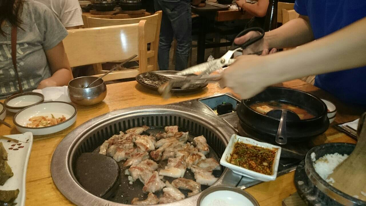 ピーチで行った釜山海雲台グルメ1 韓国 2015年10月12日 0 1日目 9月20日(日) 夕食★マッチャンドゥル ワンソグムグイ 海雲台店 パラダイスホテル、東横イン海雲台から徒歩10分海雲台駅前のメインストリートから一本入ったところにあります。隣にGS25がありました。到着したのは日曜日の18時すぎだからか、店の前には行列が出来ていました。とりあえず最後尾についたところ、前に並んでいたお姉さんが整理券を見せて、これがいるのよ、と教えてくれました。店内のレジに行くと番号をくれて、片言の英語で30分くらい待つ、みたいなことを言われました。前に4組ほど呼ばれ(韓国語なので何番が呼ばれているかわかりませんでした)次に呼ばれたときに番号を見せたら当たりだったらしく店に入ることができました。店内はそんなに広くはありませんでしたが、賑わっていました。お肉は三種類 サムギョプサル・モクサル・ハンジョンサル モクサルを2人前 あとは1人前、ご飯、テンジャンチゲを頼みました。鉄板の温度を測りながらお店の人がお肉を焼いてくれました。 [1回]