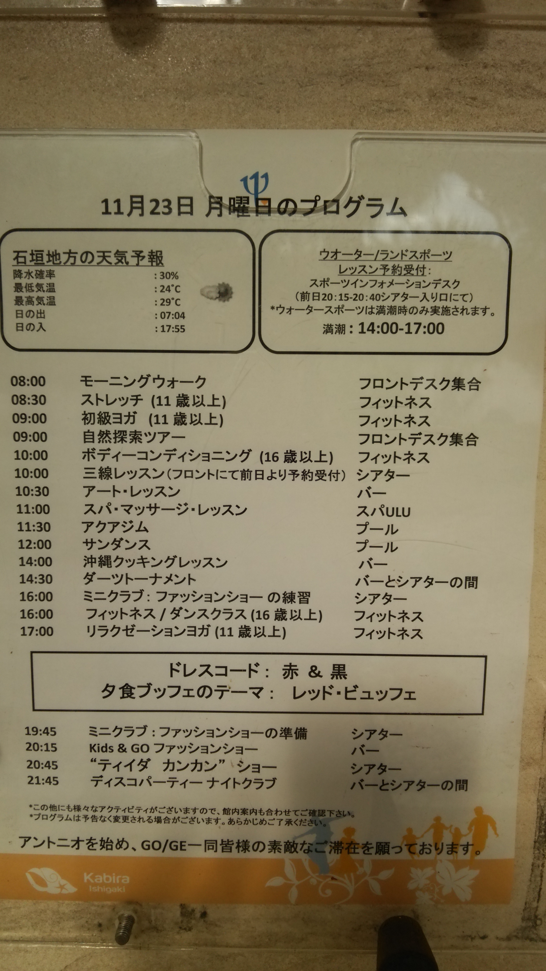 全日空で行った石垣島 その3クラブメッド石垣島 沖縄 2015年12月15日 0 11月というシーズンオフの時期、船に弱い母とシュノーケリングがしたい父、ビーチでのんびりしたい相方、島めぐりは竹富島だけにして、今回はクラブメッド石垣島カビラビーチに滞在することにしました。クラブメッド石垣島クラブメッドに泊まるのは初めてだったので義父母に喜んでもらえるか不安なまま、チェックイン。滞在中の説明は日本人の方がしてくれました。その際クラブメッドの公用語は英語で日本語で話したかったら名札に日本語のマークがある人を探してください、と言われました。そこで両親は、日本のホテルなのに!と少し気分を害した様子。システムもややこしくて楽しめそうにないと不安そうでした。2日間の滞在の中、豊富なビュッフェでの食事、リラックスできるバー、美しすぎるビーチでのシュノーケリングや、勉強になった自然探索ツアーなどを経験して、帰るころにはまた来たいね、と言ってくれて安心しました。不安だった言葉も、日本語のマークがついていないスタッフも片言の日本語で十分コミュニケーションを取ることができたので不自由は全くありませんでした。11月の終わりでビーチで泳ぐならウェットスーツを借りないと無理かと思いましたが、天気も良く日中は30度くらいまであがり水温も高く水着+ラッシュガードで気持ちよく泳ぐことができました。この日は午前中が干潮なので午後から泳ぎました。足がつくところでも魚がたくさんいて、感激しました。 1日目16時頃チェックイン 館内散策 バーでビール 18:30 夕食 席は相席ではなく4人席を希望しました。 バーでリラックス 20:15 シュノーケルツアーの予約 20:45 劇場でメインショー2日目 7:30 朝食 9:00 自然探索ツアー参加 11:30 バーで休憩 12:00 昼食 13:00 ビーチでリラックス タオルはタオルカードと引き換えにフロントで借りることができます。(12:00〜14:00はビーチハウスはクローズしシュノーケルグッズやライフジャケットを借りることができません) 14:20 シュノーケリングボートトリップ 私と母はビーチでシュノーケリング、相方と父(75歳)はツアーに参加 17:00 プールサイドでリラックス 18:30 売店で買い物直接現金で買うことができないので、フロントでショッピングカードをつくらないといけません。 19:00 夕食 19:30 バーでリラックス3日目 8:30 朝食 10:00 チェックアウト チェックアウト後もお昼を食べることができるようですが、飛行機の時間もあり断念。 滞在中は国別のリボンを腕に巻きます。 アクティビティーは張り紙でチェック夕食のドレスコードはあまり気にしなくていい感じでした。GO(従業員)の方々は色々な国のクラブメッドに転勤になるようなので、どこの国に行っても片言でも日本語を話すスタッフが多そうなので、海外でも安心できると感じました。 賛否両論があるホテルですが、私はまたぜひ行ってみたいと思いました。あと20歳若ければGOとして働きたいくらいです。 [0回]